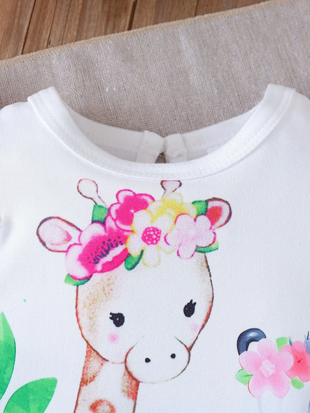 Apresentamos o conjunto de macacão infantil perfeito para o verão, onde estilo e conforto se encontram de forma encantadora. Este conjunto traz uma impressão de desenhos animados que adiciona um toque de diversão e cor ao guarda-roupa do seu bebê.