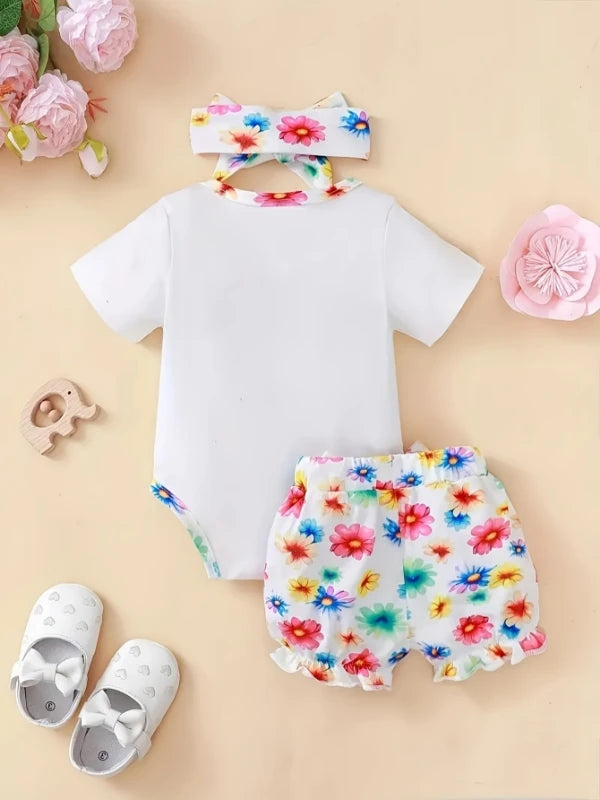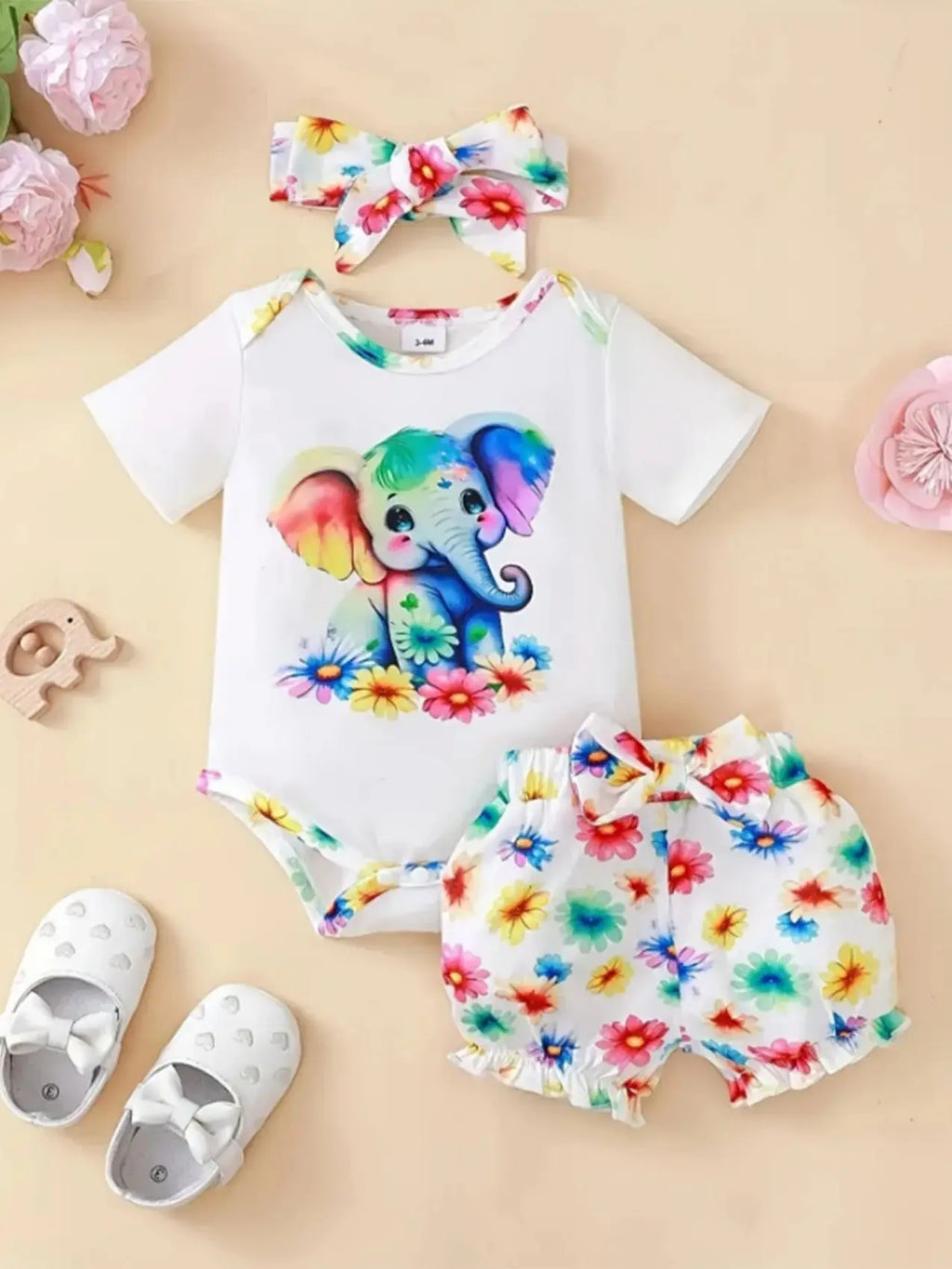 Conjunto de Roupas Bebê: Body Elefante + Shorts Florais + Faixa
