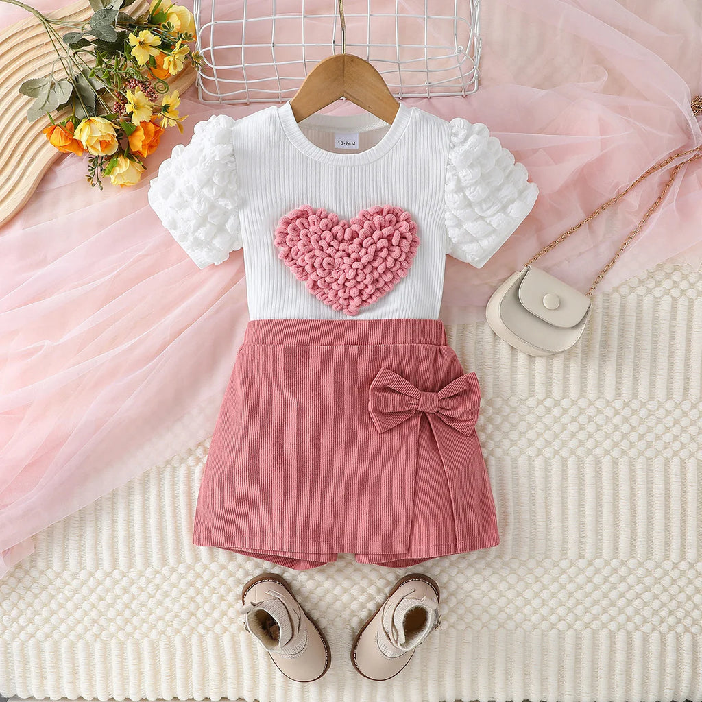 Descubra o charme e a delicadeza do Conjunto Verão Meninas, perfeito para transformar o guarda-roupa da sua pequena. Com uma blusa de manga bufante adornada por um coração em relevo e shorts rosa com laço, este conjunto é a escolha ideal para dias ensolarados.